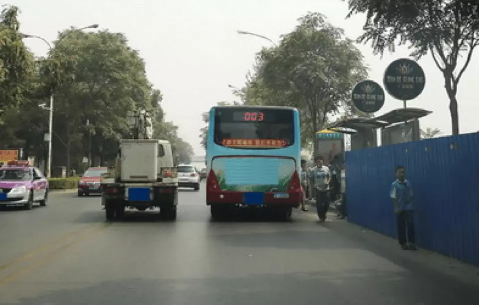 如图所示,驾驶机动车驶近这样的公交车站时,既要注意到路侧行人的活动情况随时准备减速避让,又要考虑前方道路可能存在拥堵,不应跟车过近,防止视线受阻。