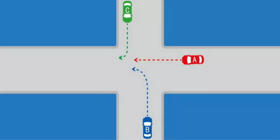 如图所示,在这种无信号灯控制情况下,A、B、C车的通行权顺序是什么?
