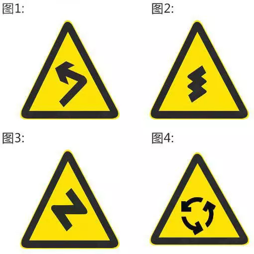 图1是向左急转弯,图2是连续弯路,图3是反向转弯,图4是环形交叉。